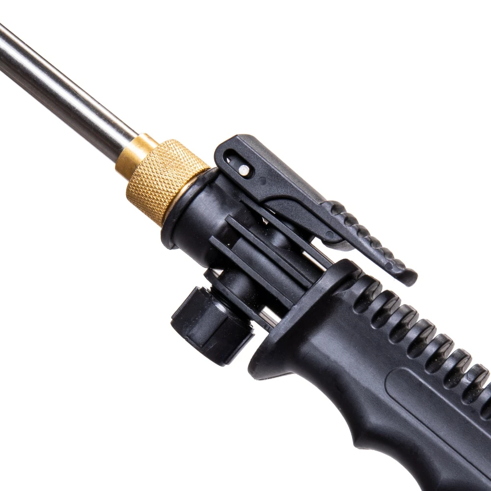 - Adjustable brass nozzle sprays liquids up to 20 feet