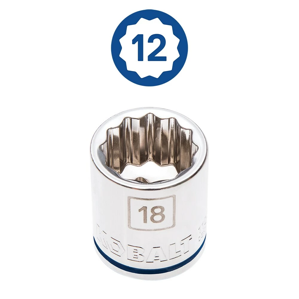 - 12-Point socket sizes include 5/16, 3/8, 7/16, 1/2, 9/16, 5/8, 11/16, 3/4, 13/16, 7/8 and 9, 10, 11, 12, 13, 14, 15, 16, 17, 18 and 19 mm