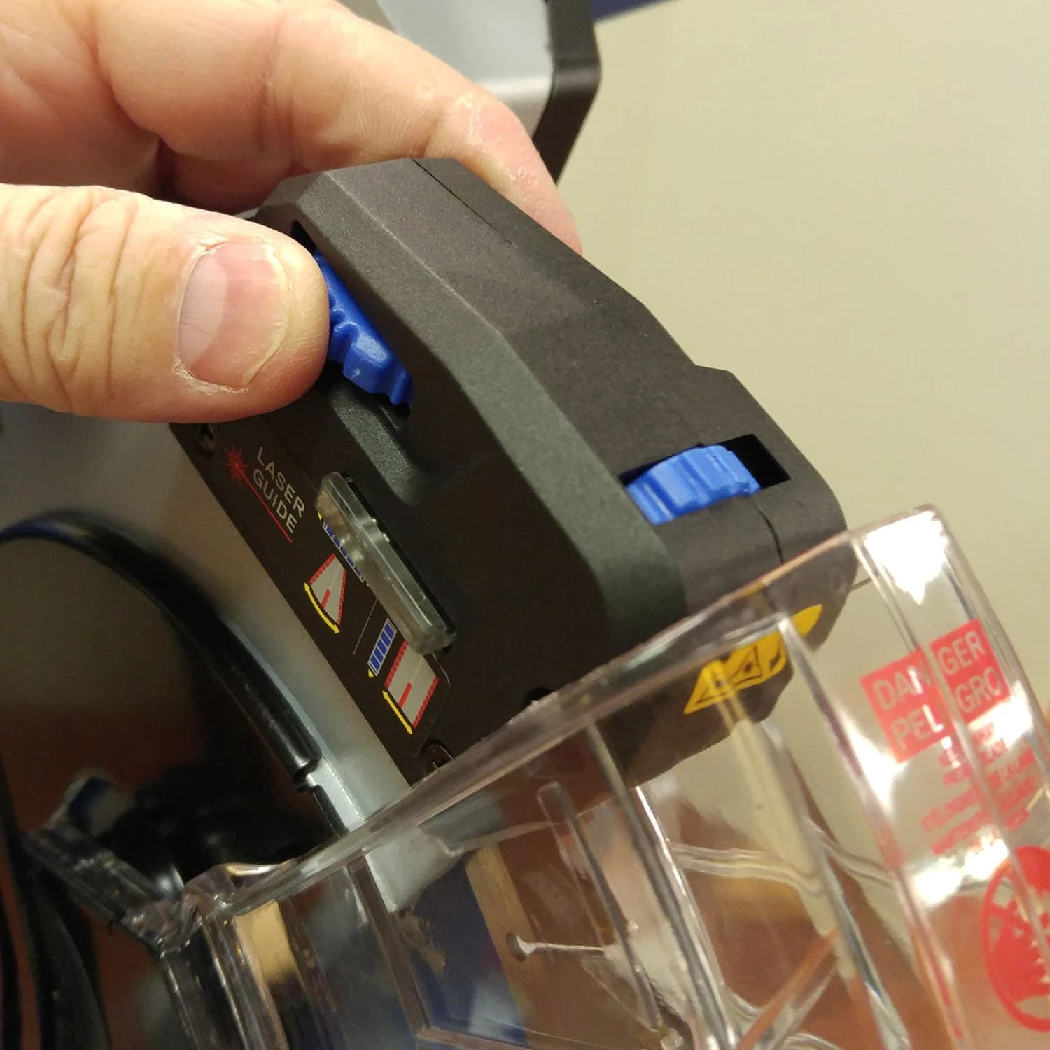 - Tool-less adjustable upfront mounted laser guide system projects accurate pre-cutting line for precise alignment