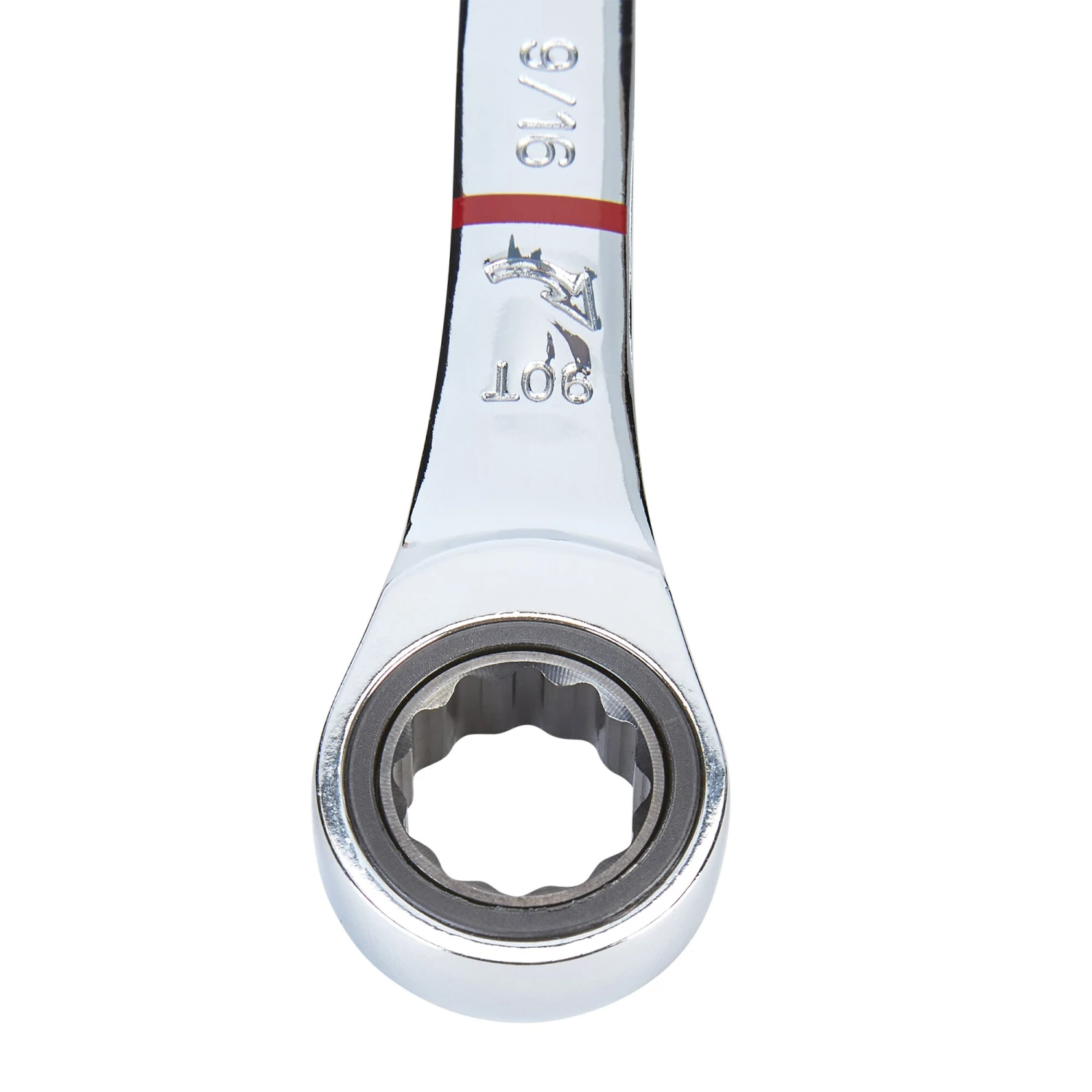 - 12-Point ratcheting box end allows work on multiple fastener types including 6-point, 12-point, square, star and some rounded